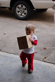 This weekend we started moving some boxes over to the new house (barely scratch the surface though). On Saturday, Emma watched as Brad took boxes into the office and stacked them against the wall. There was one box, which was just the right size for Emma so we let her carry it in and she took it right over to the stacks Brad had already made and put it right on top. It actually belonged in the kitchen but I didn't have the heart to move it at that point. We did get her to carry in one box on Sunday but she was much more interested in running around in the backyard that day. The box sort of got dumped in the middle of the office. I picked it up and put it with the other boxes but must have put it in the wrong place because she marched on over, picked it up, and moved it to another stack. She is a great little helper!