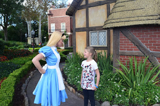 We finished breakfast and got on the monorail to Epcot. Our first stop there was Spaceship Earth, which Emma thought was amazing. It was then time for Mission Space. Josh had mentioned this ride before and really wanted to be the Commander. Emma ended up as Pilot, Brad was Navigator and I was the Engineer. There are two levels of intensity, green and orange (more intense). We chose orange. Josh and Brad thought it was the greatest thing ever. Emma and I are good with being one and done. She did enjoy the Mission Space Training Lab after the ride. Little did we know that the ride made her stomach feel a little off until after Soarin', which everybody enjoyed. She got off and said she was going to be sick so she and I tried to navigate the crowd as quickly as possible. Fortunately, she did not get sick but it took a while for her stomach to recover. We headed towards the World Showcase for lunch because Brad and I wanted fish and chips in England. While there, Emma met Alice in Wonderland and both kids posed with Mary Poppins. Mary put Josh in his place; wish we could take her with us all the time.